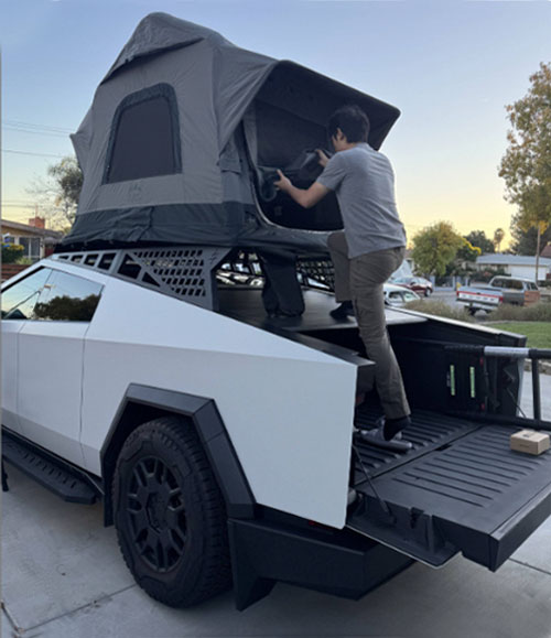 Not just a tent. A statement. Ultra-light, built for Cybertruck, and engineered from aerospace aluminum with all-weather armor. Wherever the road ends — your journey begins